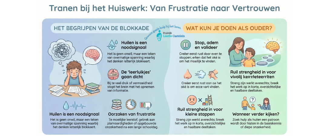 Huilen bij huiswerk betekent meestal dat de spanning te groot wordt. Je kind loopt vast en weet niet goed hoe hij of zij verder moet. Het kan gaan om de leerstof, maar ook om het gevoel dat erbij komt kijken.